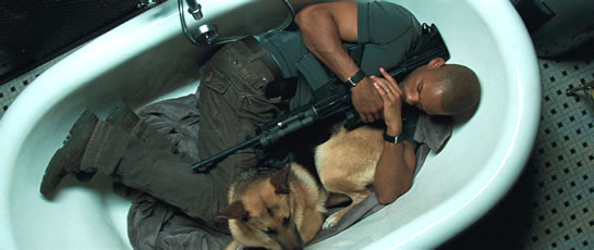 This wasn’t a particularly good movie by any means. While the first half is pretty fantastic, the second half really fell apart. But that first half… man! Though not quite as stirring as the abandoned London of 28 Days Later, the computer-enhanced New York City in this film is still quite impressive in scope and its ability to instill fear and a bit of awe in audiences as Dr. Neville (Will Smith) and his dog, Sam, roam about the city as he goes about what has become his daily routine of trying to survive by day, get home by night, and find a cure for the disease that has turned everyone into zombie-vampire-like creatures.