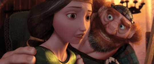 Indeed, all this sounds like typical fairy tale territory, and I believe that’s kind of the point. There are even ancient legends that turn out to be true and happen to factor both literally and metaphorically into the story of Merida’s dilemma, but other than these familiar trappings, Pixar has taken the format and created a fantastical version of medieval Scotland that is completely original and stands apart from its animated peers by allowing its protagonist to be incredibly flawed, standing in stark contrast with the noble princess who stands as a moral pillar throughout. Though Merida is quite capable and likely could lead a band of warriors into battle and come out on the winning side (to her mother’s horror, no doubt), she’s not presented as a Mary Sue type either, and the blame for much of the conflict between she and her mother lies just as much upon her own shoulders as it does the queen’s, if not even more so.