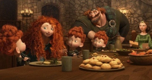 With Brave, Pixar does indeed break their high-concept streak and steps into unknown territory. Aside from the fact that, yes, this is finally a Pixar film where the primary protagonist is a female, what I’m talking about  is that, after years spent examining the lives of living toys, anthropomorphic vehicles, monsters in your closet, and all sorts of other fantastical creatures, Pixar has for the first time taken a dip into the Disney pool and is telling a story set in a traditional fantasy world, full of princesses, warriors, kingdoms, magical spells and curses, and enchanted forests. Also, in the real world, there’s even talk about the film’s hero, the flame-haired Princess Merida, soon joining the ranks of the Little Mermaid, Snow White, and Sleeping Beauty in the Disney Princess brand lineup, so there you have your marketing motivation to fuel the rumors of Pixar’s decline. But while Brave uses plenty of the same staples used by those princesses’ films, what was once familiar is luckily new again with Brave, thanks to the thoughtful production values put into this film.