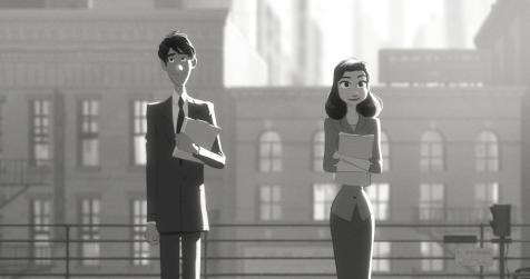 Wordless, mostly colorless, and featuring an animation style that is easily described but not easy to picture, Paperman tells a sweet story about a young desk jockey who one day encounters a beautiful girl while waiting for the train on an otherwise mundane workday morning. Caught up in her beauty, he loses track of her, and before he knows it, she’s on a departing train, never to be seen again — or so he believes. Of course, he gets a second chance, when he spots her across the way from his work window in the next building over.